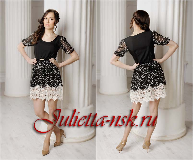 Молодежное платье полуприлегающего силуэта из однотонного крепа и шифона в горох. Линия талии подчеркнута внутренним швом «резинка». Втачные рукава припосажены кулиской. По окату рукавов небольшая сборка. Низ изделия украшен романтичным кружевом. Платье можно дополнить узким поясом. Аксессуар продается отдельно.