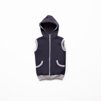 Жилет прямого силуэта с капюшоном, центральной застежкой на тесьму "молния" , накладными карманами; низ жилета на манжете, обтачки проймы, капюшона, кармана выполнены из материала основного манжета.
