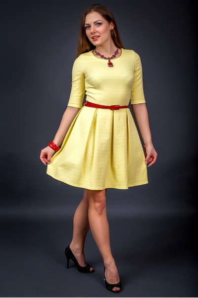 Романтическое молодёжное платье приталенного силуэта. Платье выполнено из ткани жаккард. Длина изделия 94-96см.