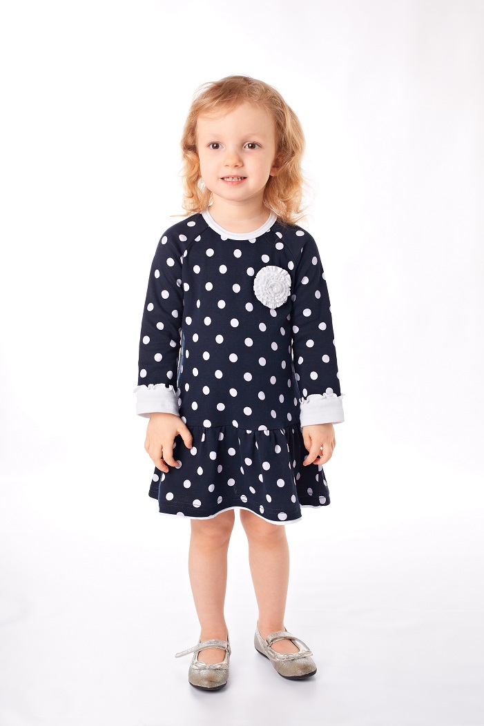 Платье с длинным рукавом реглан. Низ рукава обработан манжетом контрастного цвета. Вырез горловины обработан бейкой. Низ полочки и спинки украшает волан. На спинке платье застежка-кнопка.