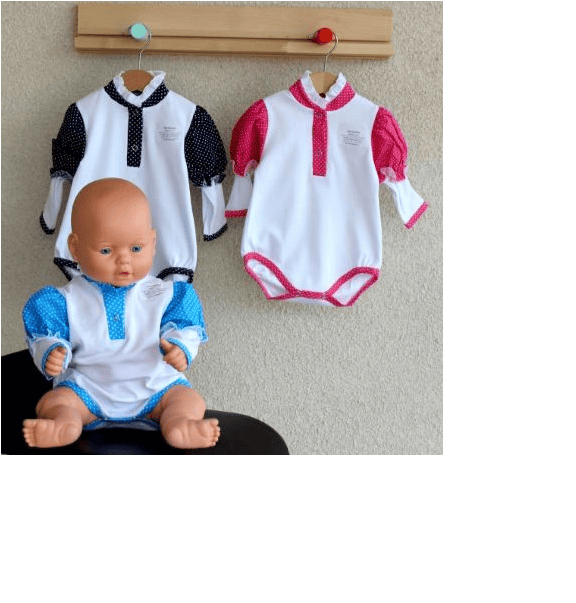 Описание модели: Боди прошит из интерлока, украшен стойкой и рукавами из кулирки. Кнопки по низу и на планке у горловины.