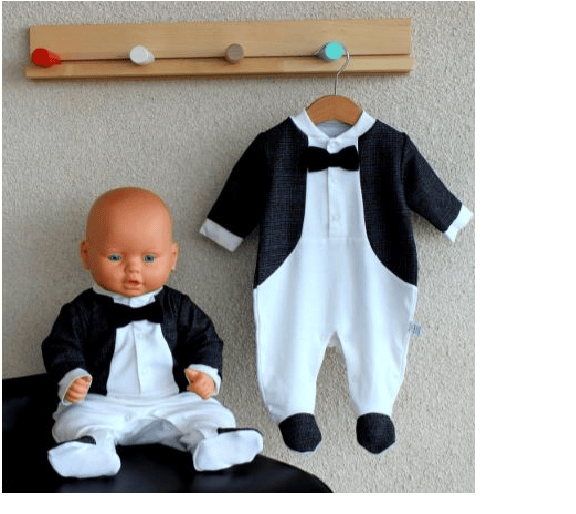 Описание модели: Комбинезон из интерлока в сочетании с костюмной тканью, обработанной подкладкой из кулирки, украшен бабочкой из бархата. Кнопки по переду и по шаговому. Размер 74-80 ножки на манжетах без лапок.